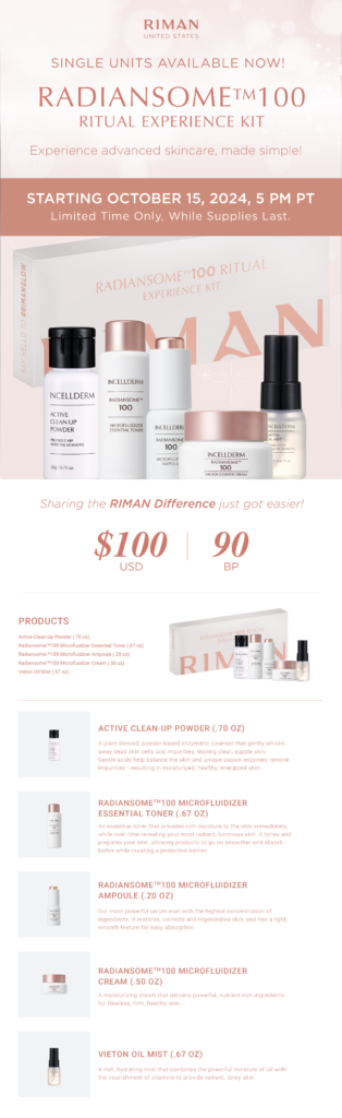 This shareable, 5-piece set contains travel sizes of the bestsellers from our Advanced Radiansome line, all packaged in an elegant giftbox featuring simple how-to instructions and product benefits!